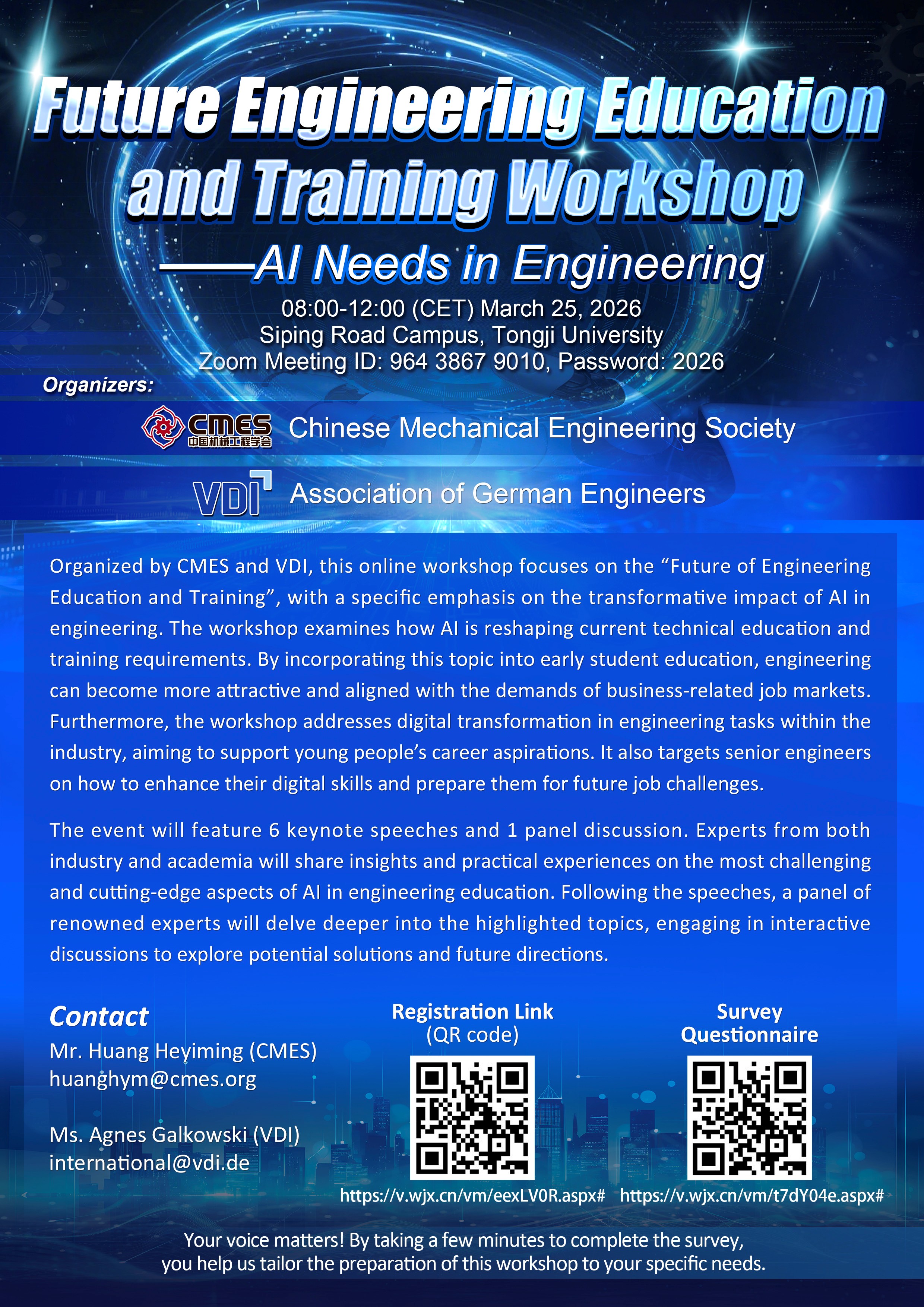 Subject: This online examines how Al is reshaping current technical education and training requirements. By incorporating this topic into early student education, engineering can become more attractive and aligned with the demands of business-related job markets. Furthermore, the workshop addresses digital transformation in engineering tasks within the industry, aiming to support young people's career aspirations. It also targets senior engineers on how to enhance their digital skills and prepare them for future job challenges. (= 6 keynote speeches and panel discussion)